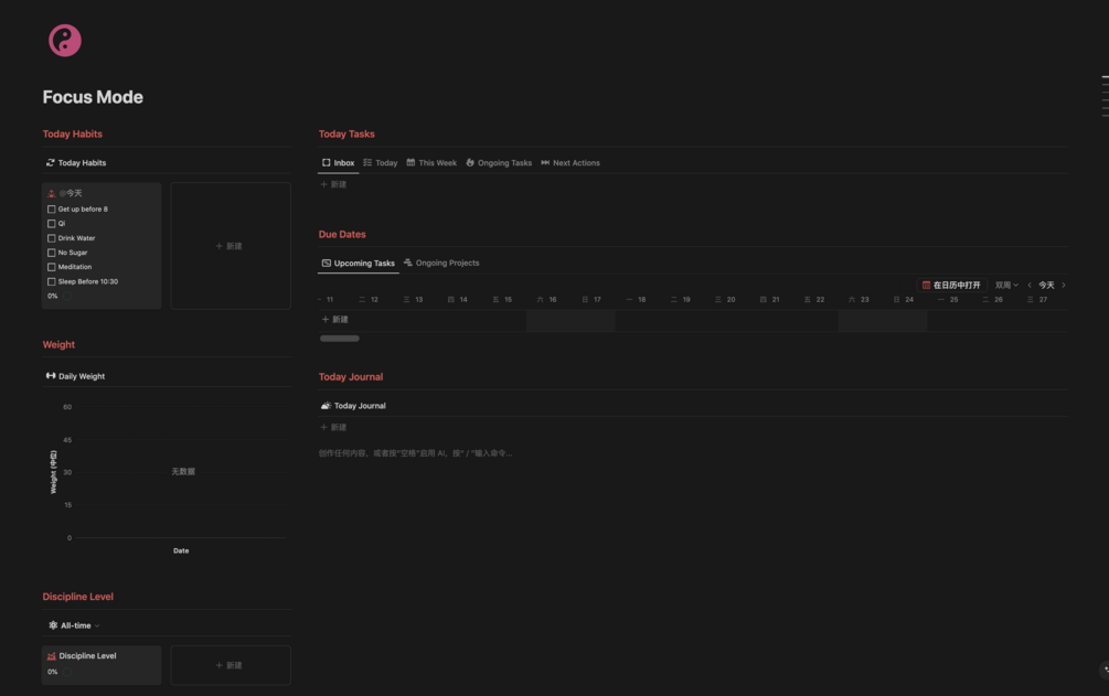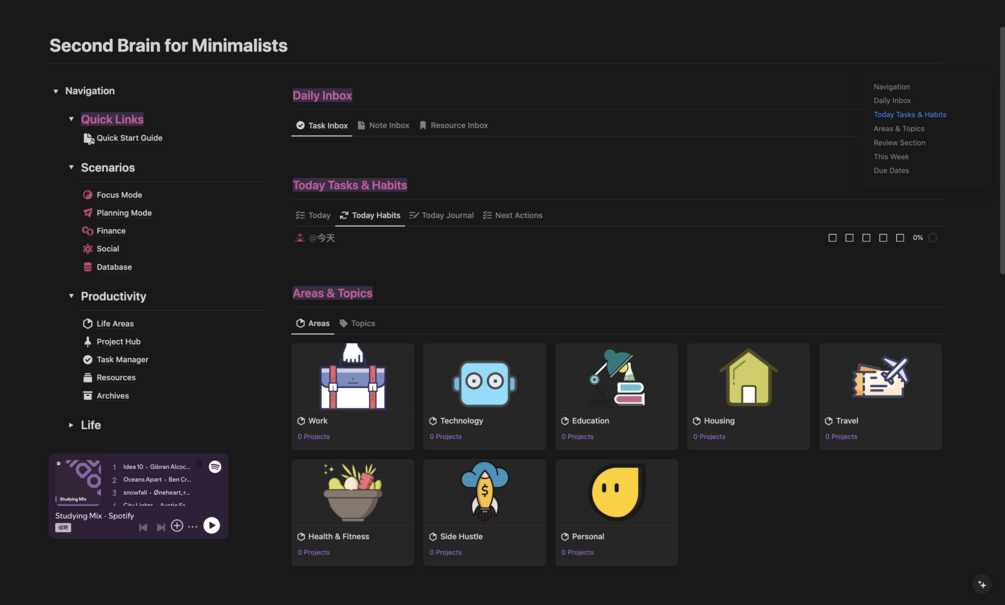 This template offers the essential features of high-end productivity tools without the hefty price tag. I've stripped away anything unnecessary, leaving a minimalist but powerful core. It's designed to boost your focus and drive, while respecting the importance of spontaneity in life.